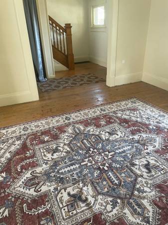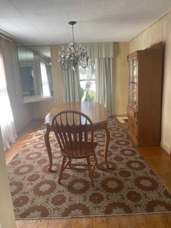 Living room in neutral colors with hardwood floors. Dining room with nice chandelier and table. Three bedrooms upstairs , hardwood in 2, carpet in one. Newer windows, Central Air, gas furnace. Washer and dryer can be used if needed. Outdoor shed.