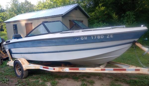 16.5 foot Boat has had new impeller and gaskets in lower unit replaced this season. Has also had a fresh oil change. Boat has been on tappan lake multiple times this season last time I took it out the starter went out. Boat has a 3.0 mercruiser 4-cylinder IO in it. Boat has 4 seats also horse shoe seating in the front. Has a cover for the engine. Boat has a plywood overlay floor is decently sturdy, needs some interior work done. Pretty decent boat for the price the starter is a pretty easy fix. This would make a great winter project. Trailer pulls straight would need to be weighed for registration. Title is clean, will not part out. Will need a battery call or text 740-229-143eight