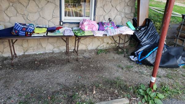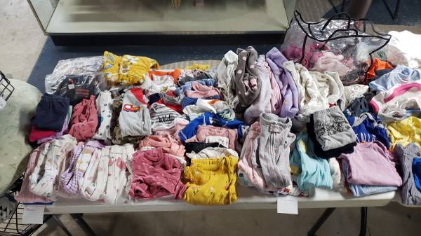 Baby/Kids clothes NB-6(8+tables worth, lots of fall/winter clothes), Adult clothes up to 6xl, shoes, books, Avon, household items, toys, purses, lots of baby items, boppy pillows, baby bouncer, pool ladder, my first trampoline. More stuff will be added as stuff is sold and room is made.