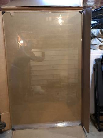 Tempered glass panel 54"x34"x3/8". The panel was cut for a tub/shower. Never used. Brand new. Creatively, it also could be used as a desk/tabletop! The cut-out on the edge would allow for cables to pass through.