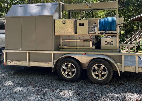 Pressure Washing Trailer set up for Softwashing. ATC 14’ all aluminum tandem trailer 7,000# GVW. Southeast Softwash skid quite nicely equipped is set on trailer along with homemade Port-a-potty and storage.